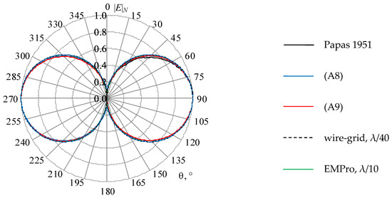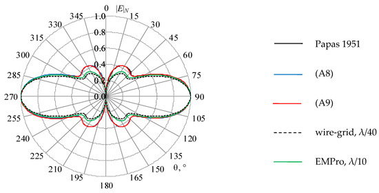 In Figure 14, Figure 15 and Figure 16 the results obtained by using the wire-grid, the EMPro (FDTD) system (λ/10 mesh was used in the further comparisons since its results seem to be closer to the analytical ones), and the analytical expressions are summarized. In general, all the results are consistent with each other. Table 6 shows the largest differences in the calculated values compared to those obtained by (A8).