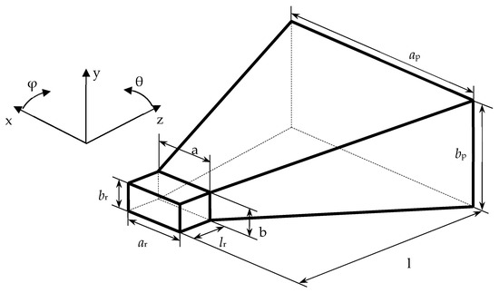 Another complex structure to be modeled is a horn AE presented in Figure 17. The cross-section of this AE is symmetrical in two planes. This AE is also simulated and tested using the wire-grid approximation, and new recommendations for modeling it are determined and provided further. The inner surface geometrical parameters of this AE are presented in Table 7. The wall thickness of the regular part of the AE is 1 mm, and the irregular part is 2 mm. For verifying the obtained results of modeling the horn RTCs, the results are compared with the measured ones for a manufactured prototype of this horn (its parameters after manufacturing are measured and also presented in Table 7). The AE was modeled using the wire-grid at an operating frequency of 8 GHz. The AE was excited by installing a wire at the junction of the regular and irregular parts of the horn between its wide walls. The length of the wire corresponded to the value b from Table 7. The wire was approximated by one segment. After performing model-testing based on the wire-grid approximation model, the following recommendations were obtained for modeling these types of AEs.