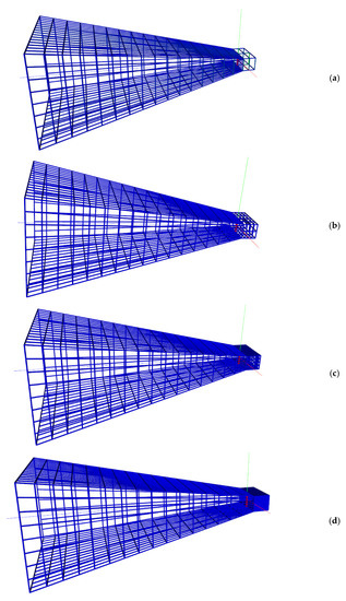 When modeling a complex structure, such as the symmetrical biconical AE presented in Figure 9, it is inappropriate to use the traditional recommendations for modeling. The number of wires and their radii are difficult to determine, as well as the radius of the wire where the excitation source is located. Moreover, to answer the questions about wire location in the grid (horizontal and vertical grid elements) and the effect of the segment step on the results is not a trivial issue here. Therefore, the following model-testing based on the wire-grid approximation model was performed in order to reveal an optimal setting for modeling such an AE structure.