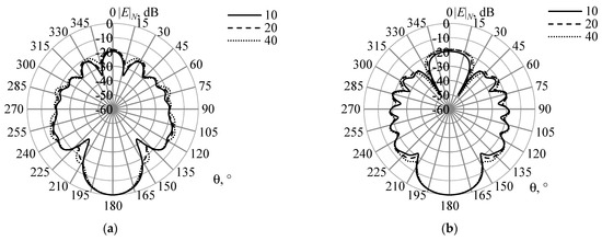 The gain (G, times) of the horn AE at the frequency of 8 GHZ in θ = 90° (a) and φ = 90° planes (b), calculated in the wire-grid, with Lr = 4 and n = 10, 20, and 40.