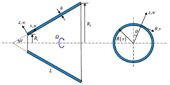 Based on elastic theory, research on vibration characteristics of spinning shell structures has been performed for a long time. Pioneering work on spinning shell structures was reported in [3], which presented the phenomenon of traveling wave vibration of spinning cylindrical shells. After that, Srinivasan et al. [4] discussed the effects of centrifugal and Coriolis forces on traveling wave vibration of the spinning cylindrical shell, and found that the Coriolis force has an asymmetric effect on the traveling wave vibration, while the centrifugal force induces the symmetric effect on the vibration. Since then, abundant studies on vibration behavior of spinning conical shells have been carried out [5,6]. Various numerical and analytical methods have been developed to investigate the vibration characteristics of spinning conical shells, such as the generalized differential quadrature method [7], Galerkin method [8], Ritz method [9,10], finite element method [11], harmonic balance method [12], and multiple scales method [13]. Donnell’s shell theory [14], Sanders’ shell theory [15], Love’s shell theory [16,17], first-order shear deformation theory [18], and higher-order shear deformation theory [19] are also widely utilized in dynamic modeling of the shell structures.