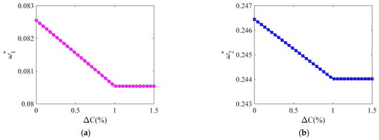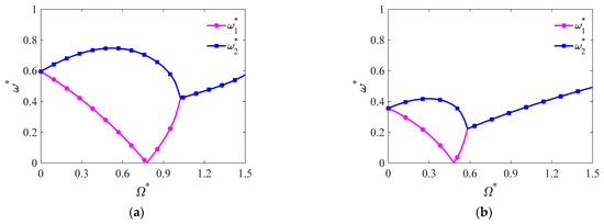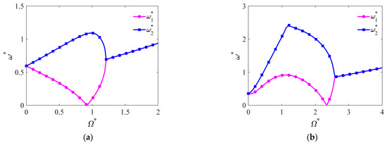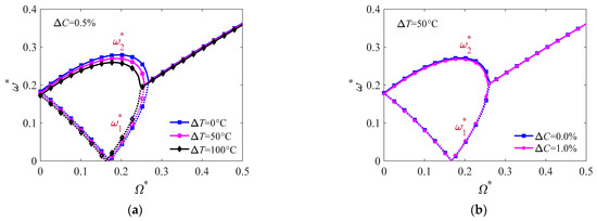 Variation in dimensionless natural frequencies of mode (1, 1) against moisture concentration (Ω* = 0.1, α = 7.5°). (a) Natural frequency of forward traveling wave; (b) natural frequency of backward traveling wave.