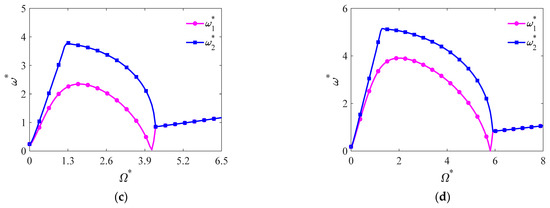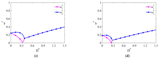 For modes (1, 2–4), it is found that with the increase of Ω*, ω1* initially ascends and then descends until critical spinning speed Ωc* appears. It can be inferred that the initial hoop tension generated by the spinning centrifugal effect results in the difference, as shown in Equation (13). Figure 3 plots the variation of the frequencies against spinning speed for modes (1, 1–4), where initial hoop tension is ignored. It is clearly seen that for modes (1, 2–4), the variation trend of ω1* against Ω* becomes similar with the mode ones (1, 1). It is also found that the values of critical spinning speed are reduced obviously compared with the case in Figure 2b–d, considering initial hoop tension. However, the critical speed of mode (1, 1) only has a slight decrease compared with that in the presence of initial hoop tension. From Figure 2 and Figure 3, one can obtain the conclusion that the initial hoop tension is the predominant factor resulting in the increase of critical spinning speed for higher modes.