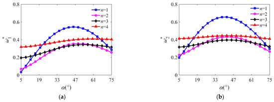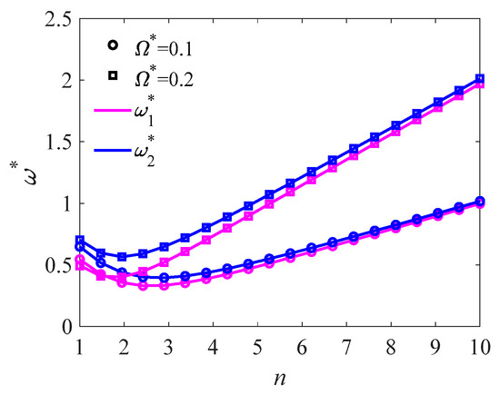 In this subsection, natural frequency and critical spinning speed of composite laminated spinning truncated conical shells in a hygrothermal environment are studied. Figure 2 displays the change in dimensionless natural frequencies against spinning angular speed Ω* for modes (m, n) = (1, 1–4). One can find a bifurcation of the frequencies when the speed Ω* exists, where ω1* and ω2* represent the frequencies of forward and backward traveling waves, respectively. For mode (1, 1), ω1* descends monotonically with Ω* until the one intersects the abscissa, and then ascends again. The value of the corresponding abscissa is critical spinning angular speed Ωc*, which means a potential divergent instability. While ω2* ascends with Ω* before the instability occurs, after that ω2* descends until it coincides with ω1*. This phenomenon is attributed to the spin-induced Coriolis and centrifugal forces, which both affect the stiffness of the conical shells. In a physical sense, the Coriolis force induces the asymmetric influence on natural frequencies of forward and backward traveling waves, which weakens the frequency of the forward traveling wave and enlarges the frequency of the backward traveling wave. However, centrifugal force stiffens the shells and enhances the frequencies of both traveling waves symmetrically. In the lower spinning angular speed region (before critical spinning angular speed), the Coriolis force has the dominant contribution in the frequencies and leads to different trends of forward and backward traveling waves. After that, centrifugal force has the more significant effect on the frequencies in the higher angular speed region, which causes the increase in frequencies of both traveling waves.