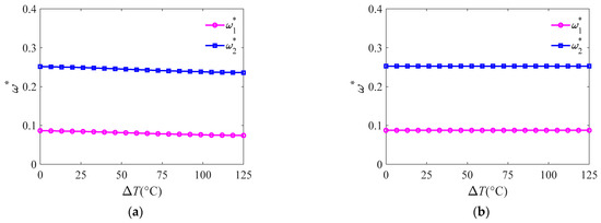 Effects of (a) thermal expansion deformation and (b) material property variation generated by temperature on dimensionless natural frequencies of mode (1, 1) (Ω* = 0.1, α = 7.5°).