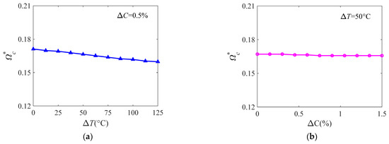From Figure 5b, it is indicated that the frequencies of both traveling waves decrease slightly with moisture concentration ΔC, which is attributed to hygroscopic expansion deformation and the reduction of elastic modulus E2. Figure 7 displays the variation in dimensionless natural frequencies against ΔC. The variation is similar with the variation trend of E2 in Table 1 against ΔC, which reveals that the elastic modulus E2 is the dominant factor in the frequencies of the shell, rather than the hygroscopic expansion deformation. Figure 8, which plots the effects of temperature variation and moisture concentration on critical spinning angular speed, respectively, demonstrates that temperature and moisture both impair the critical spinning speed of the shells, but temperature has more effect on the reduction of critical speed than moisture. Results in Figure 5, Figure 6, Figure 7 and Figure 8 reveal that the influence of moisture concentration on the frequencies and critical spinning speed of the shell are less prominent than that of temperature.