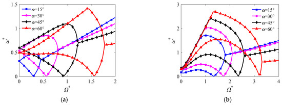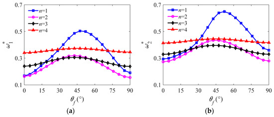 Variation in dimensionless natural frequencies against fiber orientation angle (Ω* = 0.1, ΔT = 50 °C, ΔC = 0.5%). (a) Natural frequency of forward traveling wave; (b) natural frequency of backward traveling wave.