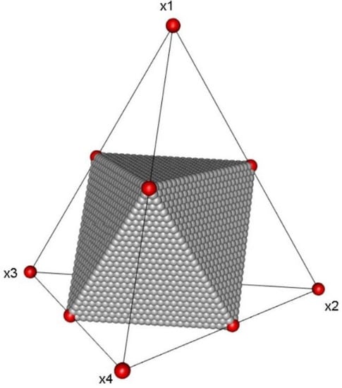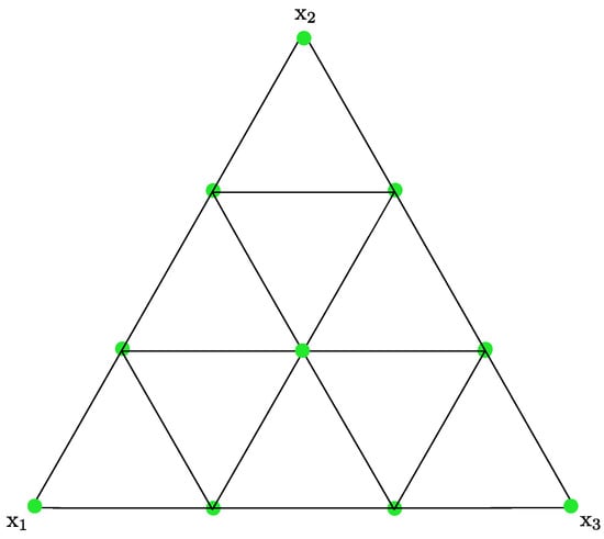 For example, let be the centroid point in the sub-simplex and take as the reference point. Using the pseudo-component transformation method to convert the vertices of will enable each sub-simplex to contain q interior points and the design to contain experimental points. However, the design constructed by this method will face the problem of “dimensional disaster” when q is larger. To reduce the number of experiments, we consider taking the center of the sub-simplex of each partition. Then, the design will only contain experimental points in total. Moreover, if the experiments are arranged with a set of higher-order lattice points, when , the number of sub-simplexes is larger than the number of a lattice point set. Further, since the convex polyhedron can be partitioned into several disjoint sub-regions, as shown in (8), then the centroid of each sub-region will be evenly distributed on the experimental region.