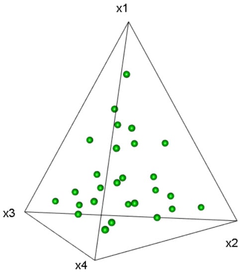 Therefore, the simplex be partitioned into 27 sub-simplexes without common interior points under the 20 design points of . The order number of four vertexes for each sub-simplex corresponds to the design point of . For example, the four vertexes of sub-simplex are composed of the vector of lower constraints and the vector of upper constraints . By calculation, we find that there exist differences among the volumes of these sub-simplexes, but the error is less than . Moreover, the distribution of the centroid for these sub-simplexes is shown in Figure 3, and the values of these centroid and each sub-simplex are shown in Table 1.