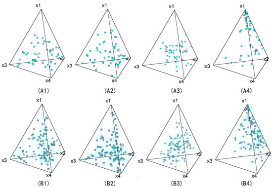 The distribution of random points in . (A1): The distribution of 50 random mixture points generated by the inverse transformation of method I (A2): The distribution of 50 random mixture points generated by the exponential inverse transformation of method I (A3): The distribution of 50 random mixture points generated by the inverse transformation of method II (A4): The distribution of 50 random mixture points generated by the exponential inverse transformation of method II. (B1): The distribution of 100 random mixture points generated by the inverse transformation of method I (B2): The distribution of 100 random mixture points generated by the exponential inverse transformation of method I (B3): The distribution of 100 random mixture points generated by the inverse transformation of method II (B4): The distribution of 100 random mixture points generated by the exponential inverse transformation of method II.