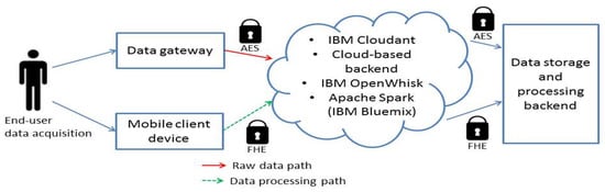 The central data processing components’ algorithmic core is designed and implemented using an improved version of the algorithmic model that is presented in []. This version includes the enhancements that have been presented in the previous section. The central data processing components are installed on the IBM Cloud platform through an adequate buildpack. The Apache Spark engine is considered in order to enhance the data access layer. The data that are acquired by the client software components are securely stored, in a fully homomorphically encrypted format, through the utilization of the IBM Cloudant platform. This is a non-relational database engine, which has been found as suitable for the storage of the collected and processed medical data. The newly collected personal health information data are detected by the Apache OpenWhisk programming service. As a consequence, the proper event handlers are called. This ensures that the newly imported data are automatically processed and safely stored. The data processing is conducted by the data processing components using the algorithmic structure and data processing pathways, which have been described.