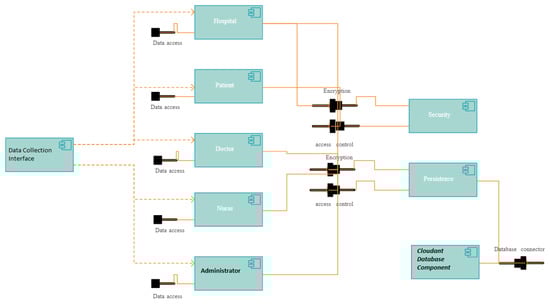 In Figure 3, the component that is labeled Data Collection Interface represents the software routines that are necessary in order to properly acquire the data that are collected by the user-side devices. Moreover, the components that are depicted in the central part of the diagram describe the main types of actors that can interact with the system: the medical actors, and the administrative users. Furthermore, the rightmost section of the diagram relates to the secure data management components. This includes the software module that realizes the connection to the Cloudant non-relational database engine, which is distinctly highlighted.