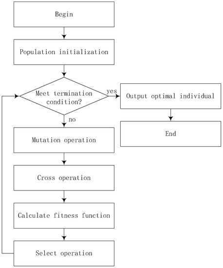 The differential evolution algorithm (DE) is a swarm intelligent optimization algorithm, which is an intelligent optimization search algorithm based on the cooperation and competition among individuals within the group. It was originally proposed by Rainer Storn and Kenneth Price [28]. The process of the differential evolution algorithm (DE) is similar to that of standard evolution algorithms (EA), including initialization operation, mutation operation, crossover and selection operation. The flow of the algorithm is shown in Figure 1.