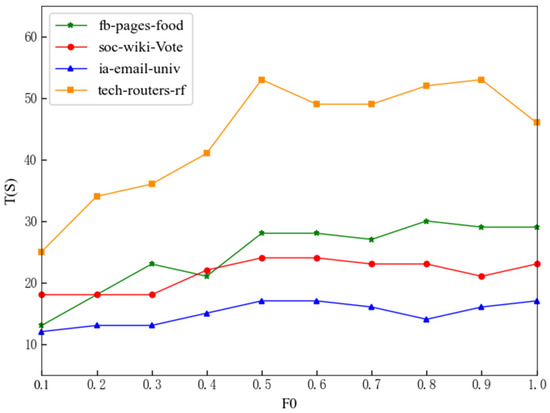 First, keeping the inertia factor w = 0.5, crossover probability CR = 0.1, the social network discrete number T(S) value with the variation factor F0 = {0.1, 0.1, 0.2, 0.3, 0.4, 0.5, 0.6, 0.7, 0.8, 0.9, 1.0} is shown in Figure 2. It can be seen that with the increase in variation factor F0, the fitness value of the IDDE algorithm on the dataset fb-pages-food, soc-wiki-vote and ia-email-univ basically tends to be stable when F0 = 0.5, and there is little fluctuation in the interval {0.5, 1}. On the dataset tech-routers-rf, the fitness value reached the maximum when F0 = 0.5. Therefore, we set the variation factor F0 to 0.5.