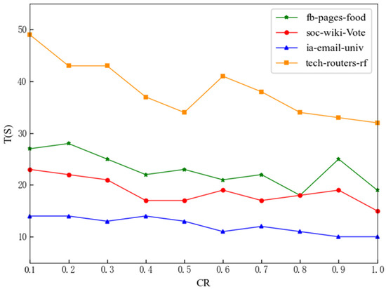 Then, keeping the inertia factor w = 0.5 and the variation factor F0 = 0.5, in the case of crossover probability CR = {0.1, 0.2, 0.3, 0.4, 0.5, 0.6, 0.7, 0.8, 0.9, 1.0}, the value of the social network discrete number T(S) varies with CR, as shown in Figure 3. It can be seen that with the increase in crossover probability CR, the fitness value of the IDDE algorithm on four datasets is reduced. Therefore, we set the crossover probability CR to 0.1.