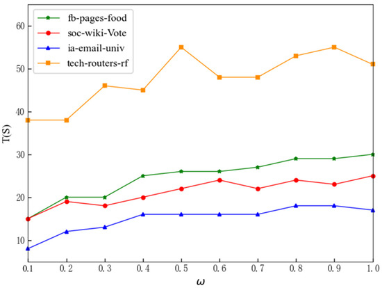 Finally, keeping the variation factor F0 = 0.5 and the crossover probability CR = 0.1, in the case of inertia factor w = {0.1, 0.2, 0.3, 0.4, 0.5, 0.6, 0.7, 0.8, 0.9, 1.0}, the value of the social network discrete number T(S) varies with different inertia factors, as shown in Figure 4. It can be seen that with the increase in inertia factor w, the fitness values on the dataset fb-pages-food, soc-wiki-vote and ia-email-univ basically tend to be stable at w = 0.5, and on the dataset tech-routers-rf, the fitness value reaches the maximum at w = 0.5. Therefore, we set the inertia factor w to 0.5.