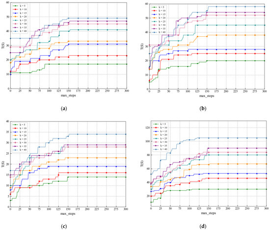 To analyze the performance of the IDDE algorithm at different numbers of iterations and population sizes, we set the inertia factor to 0.5, the variation factor to 0.5, the crossover probability to 0.1, and the initial seed set size k to 20. Firstly, the effect of the number of iterations max_steps is analyzed, the population size NP is set to 15 and the value range of max_steps is 300. In the case of the seed set size k = {5, 10, 15, 20, 25, 30, 35, 40}, the experimental results of the four real-world social networks are shown in Figure 5. As can be seen from the figure, IDDE converges on four networks within 200 iterations, so in the subsequent experiments, the value of max_steps is set to 200.
