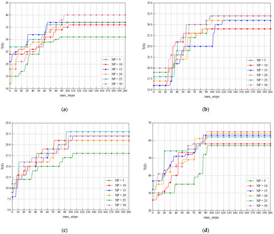 This study also analyzed the influence of population size NP on fitness value, setting the value of max_steps to 200, in the case of population size NP = {5, 10, 15, 20, 25, 30}, the results are shown in Figure 6. It can be seen that the value of the fitness function increases with the parameter NP, but when the population size is greater than 15, the fitness value does not increase significantly, so in the next experiment, we set the value of the population number NP to 15.