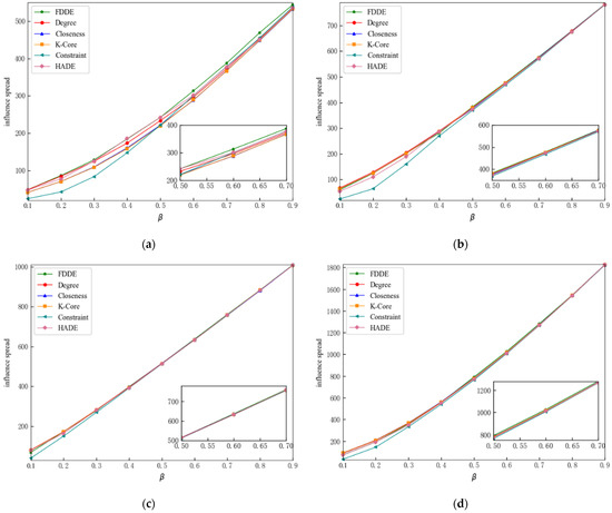 As shown in Figure 7a, the IDDE algorithm performed well on the dataset fb-pages-food. When the infection probability is different, the influence propagation range exceeds that of the comparison algorithm. However, the difference between the IDDE algorithm and other algorithms is not obvious when the infection probability is , it was after that it gradually began to show its strengths. Similarly, as shown in Figure 7b–d, in the datasets soc-wiki-vote, ia-email-univ and tech-routers-rf, the IDDE algorithm has better influence than other algorithms when .