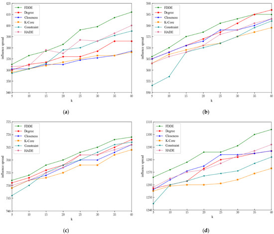 As shown in Figure 8a, IDDE performed well on the dataset fb-pages-food, all exceeding the comparison algorithm in terms of influence spread range. In addition, the IDDE algorithm has a similar HADE effect when k = 15, and the IDDE algorithm is better than the HADE when k is the other value. As shown in Figure 8b, in the dataset soc-wiki-vote, the IDDE algorithm has better influence than other algorithms at seed set sizes k from 5 to 30, but the IDDE is similar to the degree effect at k = 35, and IDDE performs worse than the degree at k = 40. As shown in Figure 8c,d, the IDDE algorithm outperformed the others in the datasets ia-email-univ and tech-routers-rf.