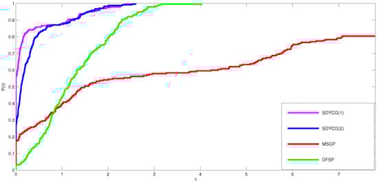 Performance profile of SDYCG algorithm versus MSGP algorithms [23], and DFSP [24] for the CPU time.