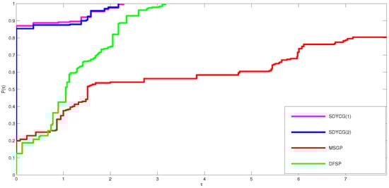 Furthermore, to ease the numerical comparisons in the above tables, we used the well-known Dolan and Moré technique [28] performance profile method. The three figures were plotted for ITER, TIME, and FVAL. Figure 1, Figure 2 and Figure 3 show that, on average, the SDYCG algorithm has less ITER, computing time, and the number of function evaluations than the DFSP and MSGP algorithms.
