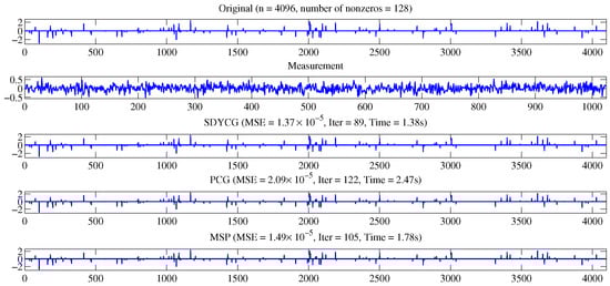 In comparison to the PCG [37] and MSP [38] algorithms, we used the SDYCG algorithm and restored the signal to almost its original form in a few iterations, MSE, and CPU time. We rua each code from the same starting point and used the same continuation strategy on parameter w. The convergence behavior of each algorithm was observed to achieve an accurate solution. As shown in Figure 4 and Figure 5, which has been replicated more than a hundred times with remarkably similar results. The SDYCG algorithm recovers the sparse single with a minimal processing time and minimal MSE error. Furthermore, for the objective function and MSE, the SDYCG method reduces faster than the PCG and MSP algorithms.