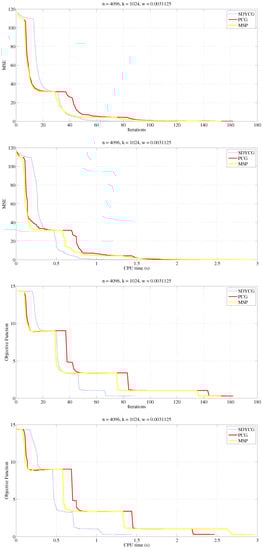 Comparison of the SDYCG, PCG, and MSP algorithms. The x-axes represent the number of iterations and the CPU time in seconds, respectively. MSE and objective function values are represented on the y-axes.