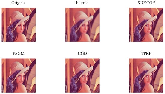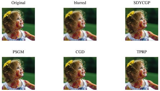 In addition, for the image restoration experiment, we used Y as a partial DWT matrix, with s rows chosen at random from the DWT matrix. This type of encoding matrix Y does not need storage and allows for quick matrix-vector multiplications of Y and . As a result, it may be tested on large images without the need to store any matrix. , , , and are the parameter values. The initial parameter values are , , , and . In this experiment, we utilized the standard Lena colour image with a size of and the colour baby image with a size of . In contrast, for performance comparison, we considered the well-known PSGM [34], CGD [35], and TPRP [36] iterative algorithms. The iteration procedure of all algorithms began at and ended when (60) was less than . Figure 6 and Figure 7 show the original, blurred, and reconstructed images generated by each algorithm. As can be seen from the figures, all of the algorithms considered generated images of similar quality. However SDYCG was quicker. As a result, we can infer that SDYCG is the winner.