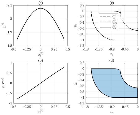 The path of movement is symmetrical with respect to axis , while the angle of rotation is an odd function. Based on the above, according to Section 2, the envelopes of hallway (Figure 2c) were established for half of the sofa. Taking into account conditions (20), the shape of one half of the sofa was obtained (Figure 2d). The calculation time for was 2.65 s, and the resulting area of the sofa differs by only from the area obtained by Gerver: [].