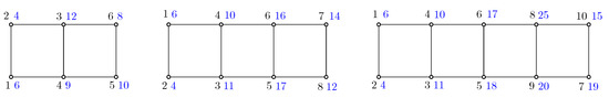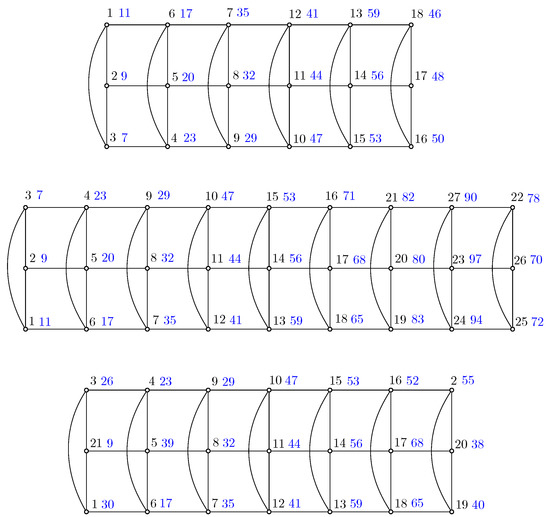 In all three cases, the weight of each vertex is distinct. Examples of the labelings for can be seen in Figure 4. □