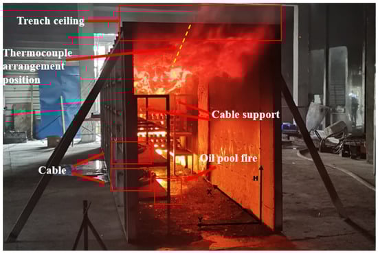Figure 1 shows the 1:1 cable trench fire test platform, with length, width and height of 10 m, 1.4 m and 2 m, respectively. The test platform is supported by a steel frame and sealed by a fireproof diaphragm to simulate the environment of an underground cable trench. This experiment is carried out indoors, the ambient temperature is 20 °C, and the influence of ambient wind speed can be ignored.