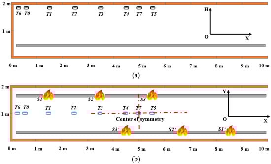 The experimental measurement system includes the temperature acquisition system in the cable trench, and the calculation and analysis platform. K-type thermocouple and Aglient34970a data collector are used for temperature measurement. The maximum temperature that can be accurately measured by the K-type thermocouple is 1000 °C. Using the Aglient34970a data collector and the self-contained acquisition software, real-time temperature acquisition and display can be realized using a computer graphical interface. The measurement frequency is 1 s each time. Eight K-type armored thermocouples of the same model (WRNK-191) are arranged 10 cm below the ceiling of the experimental platform, and are located on the center line of the cable trench, as shown by the yellow dotted line in Figure 1. The thermocouples marked T0 (X = 0.5 m) to T5 (X = 5.5 m) are arranged at equal intervals along the positive direction (longitudinal direction) of the X-axis, and the distance between adjacent thermocouples is 1 m. The measurement results of thermocouples T6 (X = 0 m) and T7 (X = 5 m) are used to verify the accuracy of the method. The fitting curve is obtained using the maximum temperature measured by T0–T5, and then the accuracy of the fitting curve is verified by using the temperature data measured by T6 and T7. The experiment adopts the symmetrical simulation of double ignition points to reduce the influence of the opening on the right side of the experimental platform on the experimental results of the left half of the channel. In this experiment, an oil pool fire is used at the ignition point, the fuel is propane, the power is 1 MW, and the ignition point is 0.1 m above the ground and below the bottom cable, simulating the working condition of a fault leading to the combustion of the bottom cable. The cable model is ZR-YJLW03 1 × 630 and the cable is mainly composed of a copper conductor layer, an XLPE insulation layer, and a PVC sheath layer. The thickness of the sheath layer is 10 mm, the thickness of insulation layer is 10 mm, and the radius of copper conductor is 20 mm. The distribution of ignition point and thermocouple position corresponding to each experimental scheme are shown in Figure 2.