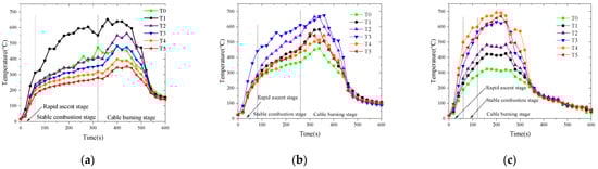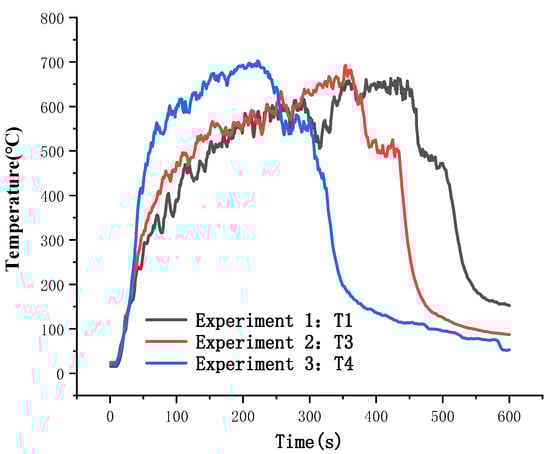 After the cable catches fire, the fire plume rises until it hits the ceiling of the cable trench, when it is blocked by and diffuses along the ceiling to both sides of the trench. During the movement, the hot flue gas constantly sucks in cooler air and exchanges heat with the wall, which has a lower temperature, and thus the temperature gradually decreases. Thus, the ceiling temperature decreases symmetrically on both sides of the center directly above the ignition point. Figure 3 shows that in Experiment 1, the temperature measured by temperature sensor T1 directly above cable ignition point S1 is the highest, the temperature measured by temperature sensors T3 and T4 directly above the ignition points are the highest in Experiments 2 and 3, respectively, and the ceiling temperature gradually decreases from the location of the ignition point on both sides, which is consistent with the above hot flue gas diffusion law.