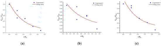 Fitting curve of maximum temperature rise of ceiling with distance. (a) Experiment 1; (b) Experiment 2; (c) Experiment 3.