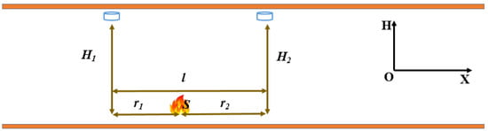 Assuming that the longitudinal distance between the two points and the ignition point is and , respectively, the distance between the two temperature measuring points is l, the maximum temperature rise measured by the temperature measuring point is and , respectively, and the vertical height between the temperature measuring point and the ignition point is and , respectively, and =, then the maximum temperature rise and corresponding to the temperature measuring point at the same height layer are equal. These parameters can be converted into equation group (4):