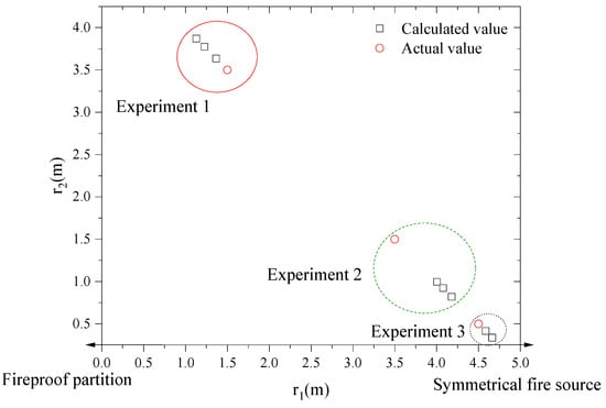 In addition, Figure 7 shows that the deviation direction of the calculated ignition points from the actual ignition point is the same within each group of experiments. Experiment 1 is biased to the side of the fireproof blocking partition, while Experiments 2 and 3 are biased to the side of the symmetrical ignition point. There are two main reasons. Firstly, the blocking partition blocks the further diffusion of the ceiling jet, and the high-temperature air flow accumulates close to the blocking partition, resulting in the high temperature of T6 measurement. Secondly, the symmetrical ignition point overlaps with the actual ignition point temperature field, which makes the measured temperature of T7 higher. In Experiment 1, the ignition point S1 is close to the blocking partition, and the temperature rise effect of the blocking partition plays a main role, while the ignition points in Experiments 2 and 3 are closer to the corresponding symmetrical ignition points, so that the temperature rise effect of the symmetrical ignition point plays a main role.