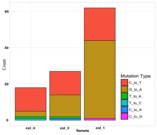 From Table 1, we may conclude that the genome of B. subtilis colony #1 had the highest number of SNPs compared with all other samples since the corresponding third column in the figure is red, indicating a high SNP count. In addition to the SNPs caused by EMS (C-to-T and G-to-A transitions), other mutation types, including T-to-A, C-to-G, C-to-A, and T-to-C transitions, could be found in the genomes. However, these were rare, with no more than one such SNP in each sample (Table 1 and Figure 1).