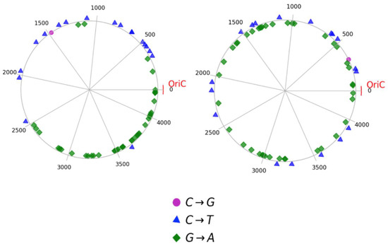 In addition, there was a significant difference in the mutation cluster density in different regions of the genomic space. WGS data from colony #1 revealed an uneven distribution of mutations in the genome, characterized by strong clustering in the region from 3,500,000 to OriC, whereas clustering in the other regions of the genome was not as dense. Thus, these findings indicate an asymmetric distribution of mutations, consistent with the pattern observed in Gram-negative E. coli.