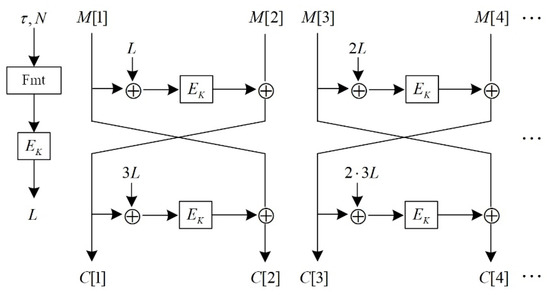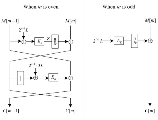 It is essential to judge the parity of the last plaintext block’s index number m when processing the last plaintext block so that different structures are employed for encryption processing. Figure 2 shows the schematic diagram. According to the definition of reference [31], the specific expression of the multiple function 2X is as follows: