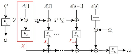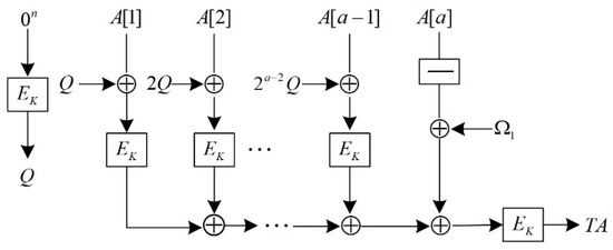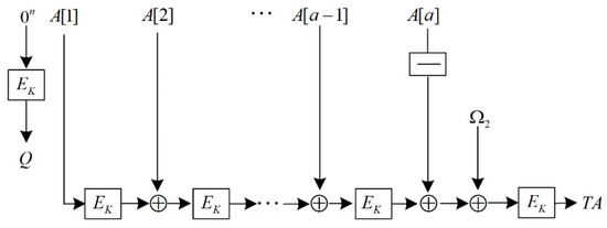 When AES-OTR processes the associated data, it first divides the associated data into 128-bit blocks, represented as , and represents the i-th associated data block. When the last block is less than 128 bits, it must be padded to 128 bits, which is expressed as or . AES-OTR employs both parallel and serial structures to process the associated data and finally generate TA. Figure 3 and Figure 4 show the structure diagrams.