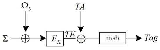 Figure 5 shows the tag generation process. The intermediate value TE is obtained by employing the input mask to encrypt the checksum, and then the XOR operation is performed using the TA obtained in the associated data processing; finally, the Tag is obtained to complete the authentication. The checksum’s expression in the process is related to the parity of the plaintext block m. When m is an even number,