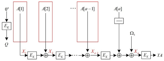 Arbitrarily selecting two associated data blocks and as the forgery objects, and setting the forged two new associated data blocks as and , where and , then the associated data’s re-forged block can be expressed as . After the first a−1-associated data blocks are encrypted with AES, the intermediate variables obtained are in turn . Thus, after processing the two associated data blocks of and , the obtained intermediate variable expression is as follows:
