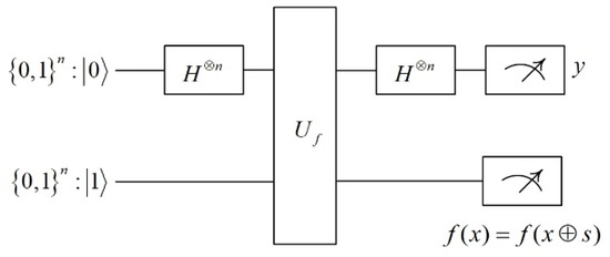 Among them, is a function constructed by the block cipher algorithm . From the expression, the period in is s, and the period in is . The solution of the nontrivial period s is performed using Simon’s quantum algorithm. Figure 8 shows the quantum circuit diagram of Simon’s algorithm.