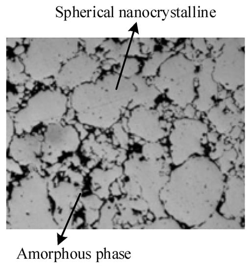 The material simulated in this paper is FINEMET nanocrystalline soft magnetic alloy. Through a ZEISS-40MAT optical microscope [15], it can be observed that the microstructure of the alloy is spherical nanograins of different sizes randomly distributed on the amorphous matrix, as shown in Figure 1.