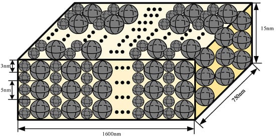 The three-dimensional mesoscopic model of the material is shown in Figure 3. As can be seen from Figure 3, in the established model, spherical nano grains with diameters of 3 nm and 5 nm are horizontally embedded in the amorphous matrix. The overall size of the model is 1600 nm × 750 nm × 15 nm.