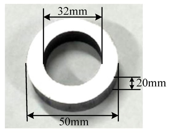 In order to verify the correctness of the model, the main DC magnetic properties (static characteristic parameters) of nanocrystalline soft magnetic alloy were tested by a direct magnetic testing system that is produced by the Magnetic Measurement Laboratory of China National Institute of Metrology (model: NIM-2000S). Including static saturated magnetic field Hs, saturation magnetic induction intensity Bs and coercivity Hc. The test ring is shown in Figure 4. Its dimensions are: inner circle diameter = 32 mm, outer circle diameter = 50 mm and thickness h = 20 mm. Finally, the static characteristic parameters of the nanocrystalline soft magnetic alloy are as follows: static saturated magnetic field Hs is 225 kA/m, saturation magnetic induction intensity Bs is 1.24 T and coercivity Hc is 310 A/m [15].
