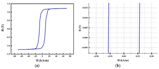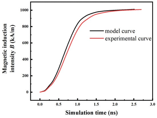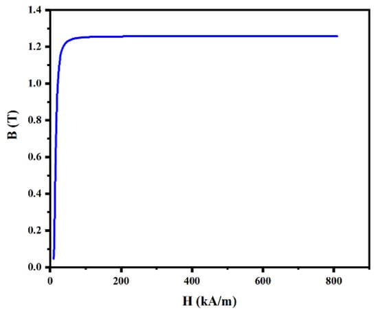 It can be observed from Figure 5 that when the external magnetic field of the nanocrystalline soft magnetic alloy is 220 kA/m, the material tends to be saturated, that is to say, the static saturated magnetic field Hs of the material is 220 kA/m. At the same time, the saturation magnetic intensity Bs of the material is 1.247 T. It can be observed from Figure 6 that when the magnetic induction intensity is 0, the applied magnetic field is about 307 A/m, that is, the coercivity Hc is 307 A/m. Table 2 compares the calculated data of the model with the experimental data of nanocrystalline soft magnetic alloys. Meanwhile, the magnetization curve obtained through the modeling tool is presented and compared with the experimental curve, as shown in Figure 7.