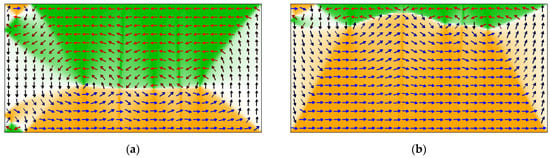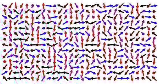 It can be seen from Figure 8 that in the initial state, the magnetic moment of the material is randomly distributed, where the unit magnetic moment is represented by an arrow. Here, → represents the positive direction of the X-axis, and vice versa; ↑ represents the positive Y direction, and vice versa. When the arrow is blue, it is deflected to the positive X-axis, when it is black, it is deflected to the negative X-axis and when it is red, it is deflected to the Y-axis. When the external magnetic field is applied to the material, the magnetic moment begins to deflect, which is mainly manifested as: the magnetic moment whose initial direction is closer to the direction of the external magnetic field is deflected first, and first deflects to the same direction as the external magnetic field. Therefore, the region within the system composed of these magnetic moments that are first deflected reaches saturation earlier. Figure 9 shows the distribution of the unit magnetization vector m in different directions during material magnetization.