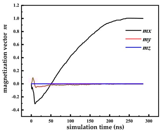 As can be seen from the figure, mx at the beginning of the simulation time decreases and the value of my increases and then decreases. This is because the magnetic field strength is not enough to compete with the magnetocrystalline anisotropy field inside the material. When the magnetic moment deviates from the direction of the material’s easily magnetized axis, the magnetic moment is acted on by an equivalent magnetic field along the easily magnetized axis. Deflect the magnetic moment in the direction of the easily magnetized axis. Specifically, in the magnetization process, part of the magnetic moment is first reversely deflected to the X-axis direction and then forward deflected to the external magnetic field direction.